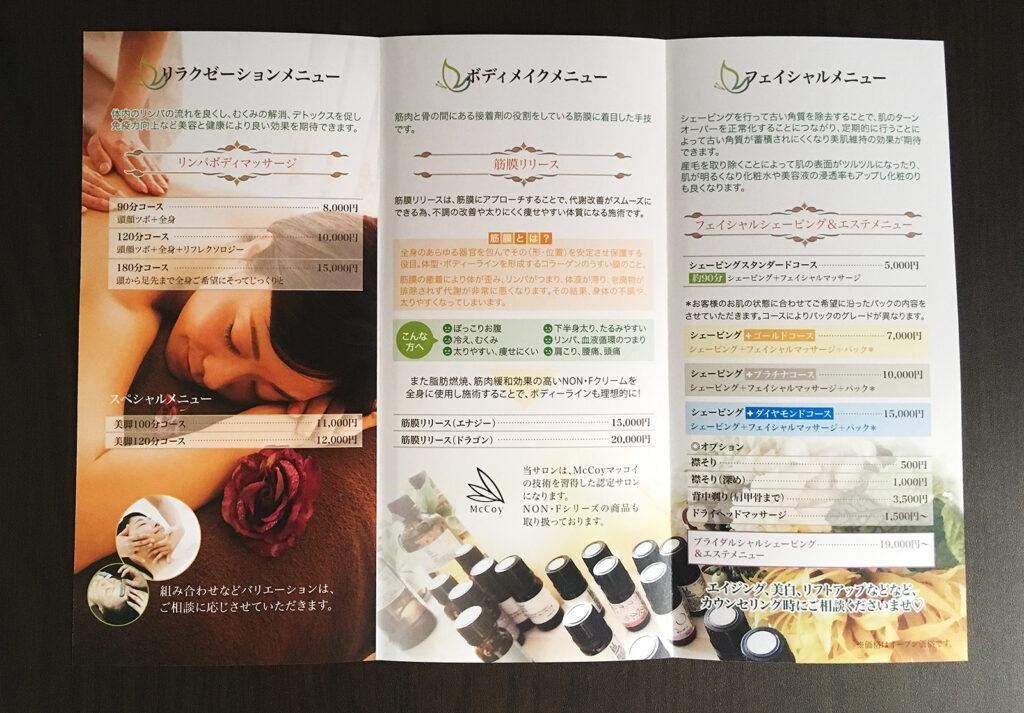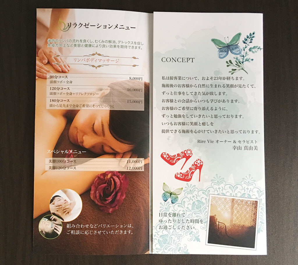 以前ホームページの制作も紹介させていただきました、「リラクゼーションサロンRire Vie(リール・ヴィー)」様の3つ折りパンフレットを作成させていただきました。